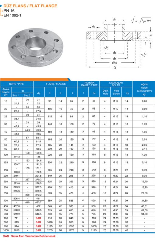 Düz Flanş PN6 Basınç Sınıfına Dayanıklıdır. TS-ISO 7005-1 TYPE 1 B / EN 1092-1 TSE Belgesi Vardır.